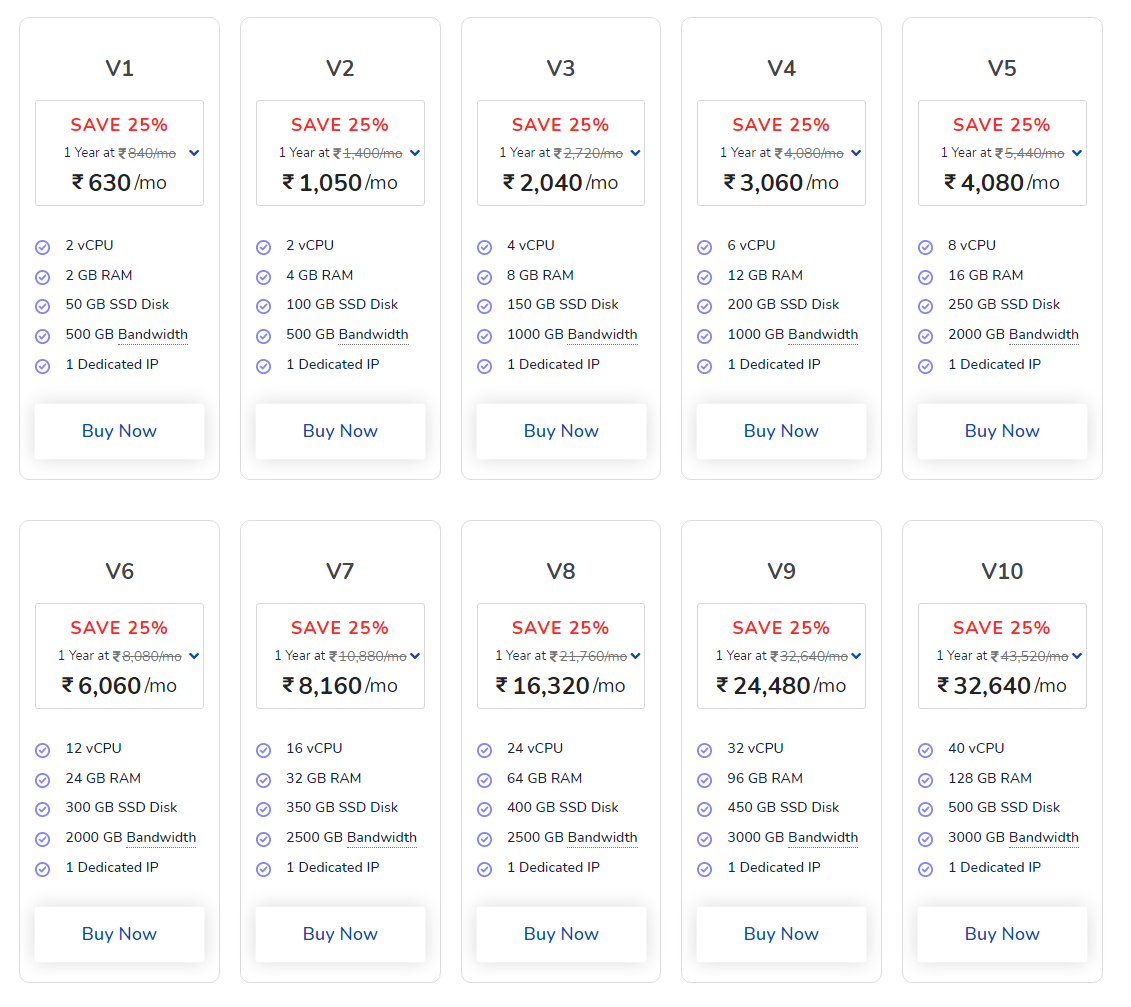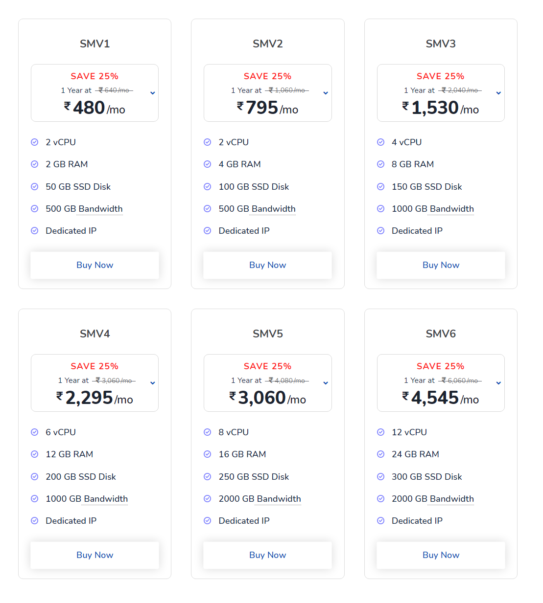 On an annual plan subscription, the high-end plan SMV6 costs Rs. 4545/mo and includes 12vCPU, 24 GB RAM, 300 GB SSD Disk, 2000 GB Bandwidth, and Dedicated IP.